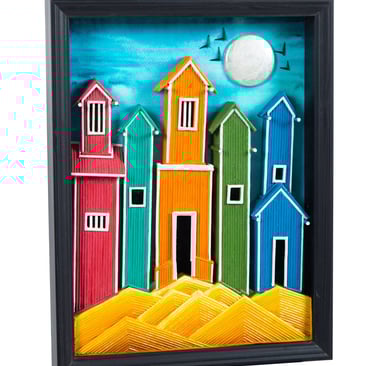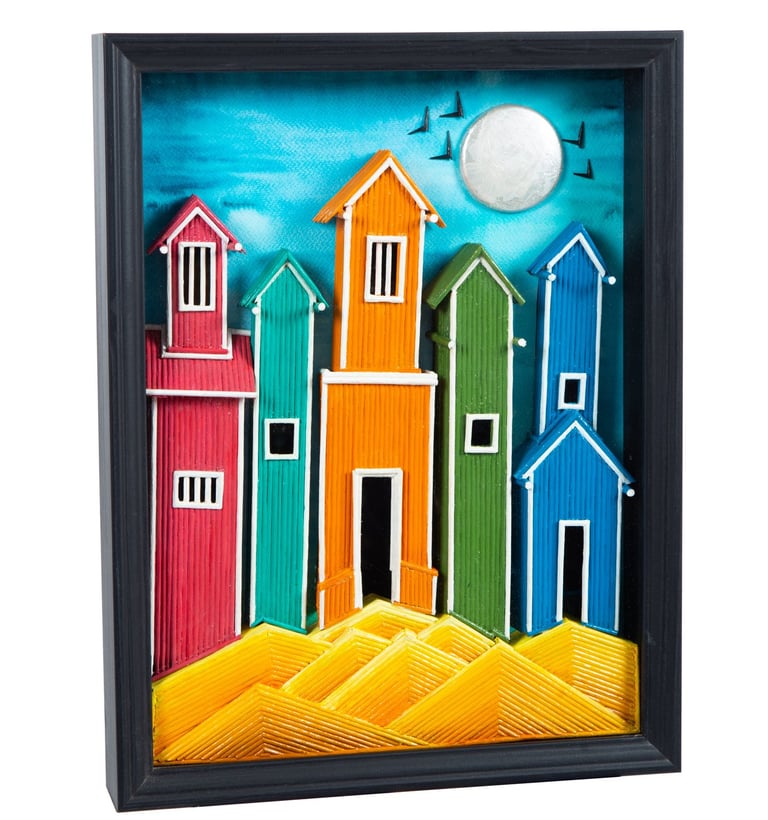 This stunning 3D artwork. Intricately crafted from precisely cut bamboo sticks, the Austrian mountain houses come to life with vibrant colors inspired by Houten, Netherlands. The meticulous arrangement forms an enchanting landscape within an elegant black box frame, evoking the charm of architecture. This piece serves as a visual escape, capturing the essence of picturesque mountain abodes and celebrating the fusion of natural materials with artistic ingenuity.