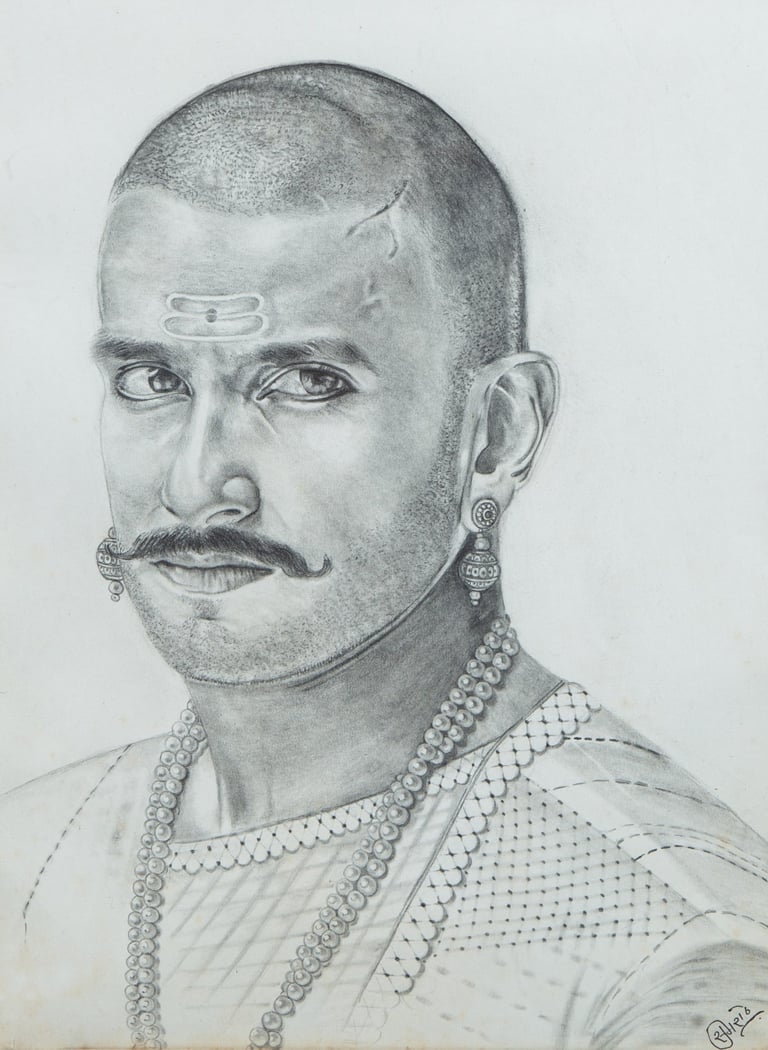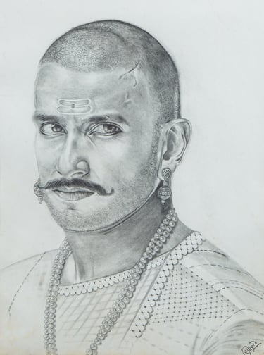 This captivating sketch beautifully portrays the vibrant and energetic essence of Bollywood actor Ranveer Singh as Bajirao Peshwa. The artist's meticulous attention to detail perfectly captures the sharp features that define Ranveer's portrayal of the legendary Bajirao Peshwa. With an impeccable blend of intensity and charisma, the sketch exudes the real personality of Bajirao Peshwa, bringing forth his commanding presence and unwavering spirit. Encased within an elegant white frame, the artwork exudes a sense of luxury, adding to its allure. This masterpiece pays homage to Ranveer's incredible performance and serves as a visual testament to the indomitable spirit of one of history's most celebrated brave warriors of the Maratha empire.