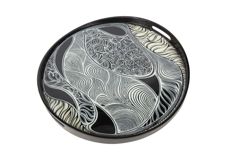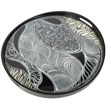This resin art tray on MDF is a striking fusion of form and function, featuring intricate, flowing abstract designs in a bold black and off-white palette. The delicate patterns create a sense of movement, while the glossy resin finish enhances the piece's visual appeal and durability. This tray combines practicality with elegance and is perfect for adding a modern, artistic touch to any setting. Its round shape and integrated handles make it ideal for serving, while its captivating design ensures it doubles as a beautiful decorative element in any home.
