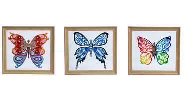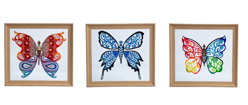 This exquisite artwork is a testament to the artist's skill and creativity. A delicate butterfly design is intricately carved into a plain sheet of paper, meticulously shaped, and painted with vibrant, captivating colors. The artwork is then carefully sandwiched between two glasses, preserving its fragile beauty. Framed elegantly, it becomes a captivating centerpiece that effortlessly draws the eye. The combination of intricate paper cutting, vibrant colors, and elegant framing creates a truly mesmerizing piece that captures the essence of nature's grace and invites admiration from all who behold it.