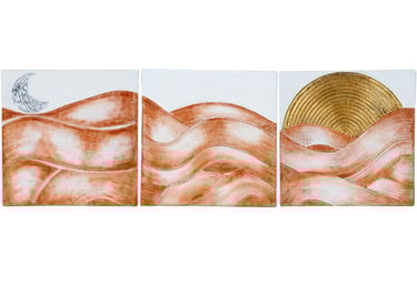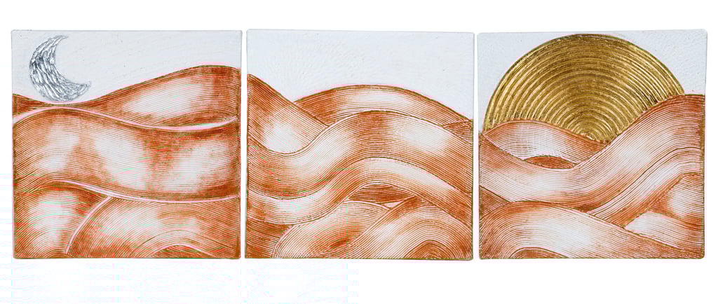 This striking triptych art piece beautifully captures the essence of time's passage through a textured depiction of desert-like dunes, accentuated by metallic foil elements. The flowing, wavy lines across the three canvases create a seamless transition from night to day, with a silver-foiled crescent moon gracing the left panel and a radiant golden sun rising in the right. The warm, earthy tones of the dunes contrast with the cool silver and bright gold accents, adding a sense of depth and movement. This harmonious blend of natural and celestial imagery evokes themes of duality, continuity, and balance in nature.