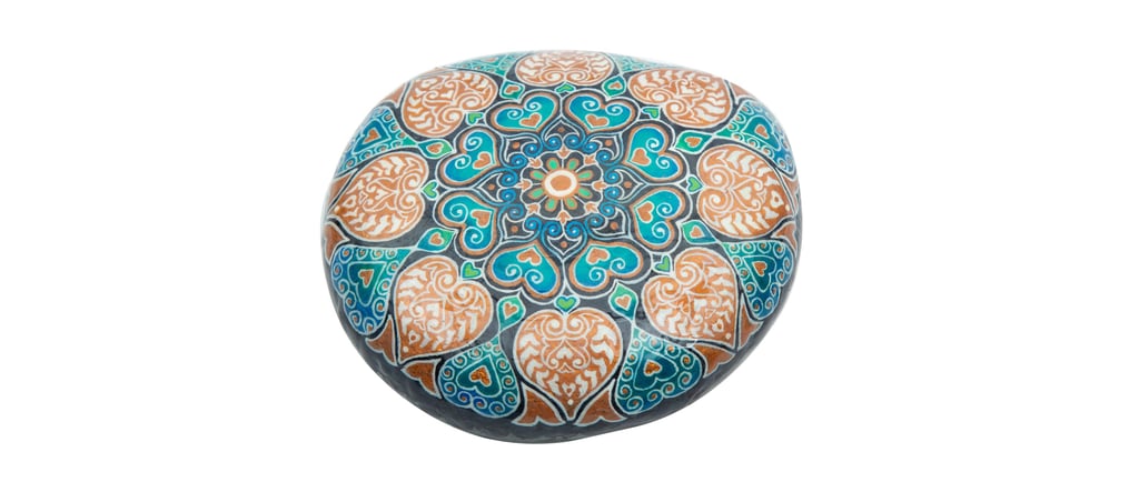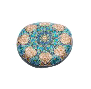 A serene pebble from the River Ganges emerges as a canvas of cultural reverence, adorned with an intricate traditional design hand-painted using acrylic colors. This miniature masterpiece intricately captures the spirit of the sacred river, each stroke reflecting meticulous artistry and a profound connection to tradition. The smooth surface of the pebble serves as a testament to the harmonious blend of nature and human creativity, transforming a simple stone into a symbol of elegance and cultural resonance. This artful creation resonates with the essence of the Ganges, encapsulating its spiritual significance in a compact yet profound form.