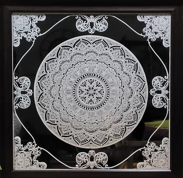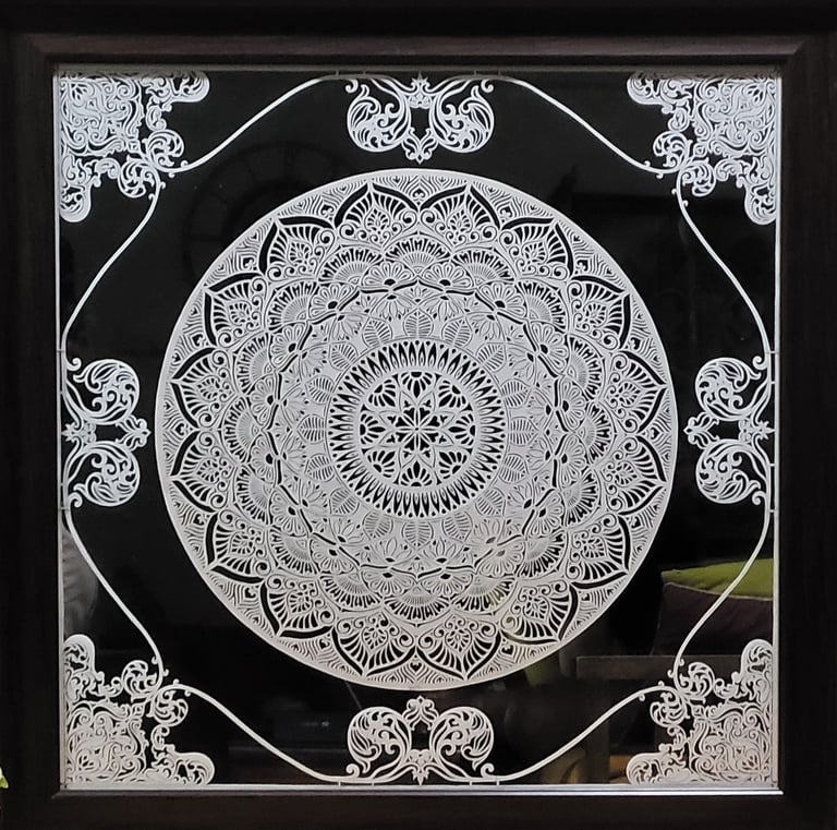 This purely handcrafted mandala paper cutwork is a testament to artistic dedication and precision. Intricately designed with flawless symmetry, the patterns radiate harmony and balance. The mirrored backdrop enhances its allure, adding depth and a dynamic interplay of light. Encased in an elegant frame, this masterpiece embodies the perfect blend of craftsmanship and spirituality, making it a timeless piece of art.