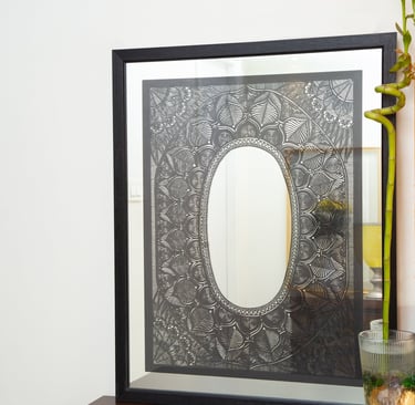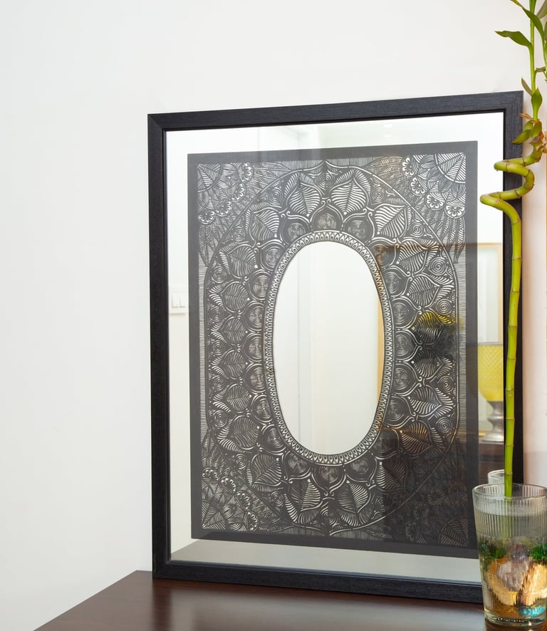 This exquisite handcrafted artwork features detailed black paper cutwork intricately designed to perfection, leaving no room for error. The elegant oval centerpiece is surrounded by finely detailed floral and leaf patterns, highlighting exceptional craftsmanship. Sandwiched between a glass panel and a mirror, the piece beautifully combines artistry with functionality, creating a sophisticated addition to any space.