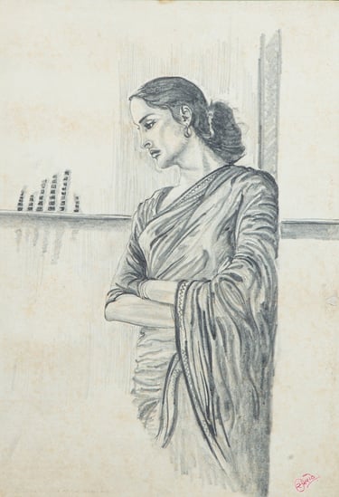 Capturing the timeless beauty of Bollywood icon Nutan, this handmade sketch radiates elegance and simplicity. The artist skillfully conveys the actress's grace, immersing viewers in a nostalgic tribute to Hindi cinema's golden era. Encased in a raised frame, unique and antique in appearance, the sketch is a visual journey through glamour and subtlety. Coated with varnish for preservation, this portrait not only echoes Nutan's allure but also stands as a cherished piece of cinematic art with a touch of vintage sophistication.