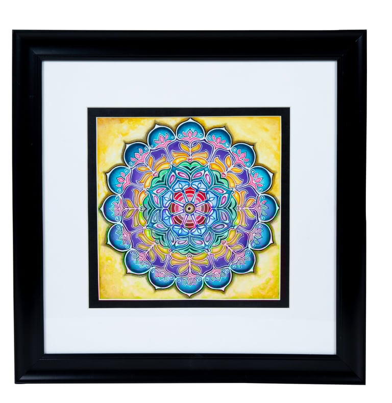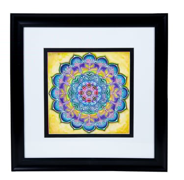 This hand-painted mandala art painting is a true masterpiece, created with vibrant watercolors that bring the artwork to life. These rich and vibrant hues enhance the intricate details and mesmerizing patterns of the mandala design. To further elevate its beauty, the painting is carefully framed in an elegant white frame, adding a touch of grace and sophistication to the overall composition. The combination of the stunning colors and the exquisite frame truly make this art piece a magnificent sight to behold. It would be a perfect addition to any art lover's collection, as it exudes both vibrancy and elegance.