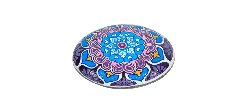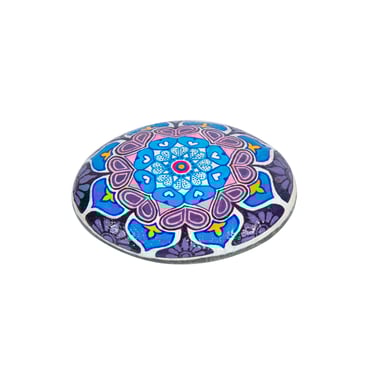 This pebble, sourced from the sacred river Ganga, features an enchanting mandala design with a cool-toned color palette. The vibrant shades of blue and purple are intricately arranged in symmetrical patterns, with the center boasting detailed motifs in pink and light blue, radiating outward into petal-like shapes outlined in lavender and violet. Accented with bright yellow highlights, the design evokes a sense of calm and balance. The cultural and spiritual connection to the Ganga adds profound significance to the piece, making it a unique blend of artistic expression and symbolism. This pebble can serve as a cherished reminder of peace, spirituality, and the beauty of nature.