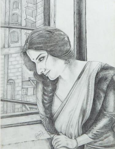 This stunning hand-drawn sketch showcases the timeless beauty of Bollywood actress Vidya Balan. Every intricate detail captures her candid charm, allowing her eternal grace to radiate from the paper. The artist's skilled hand has flawlessly depicted Vidya Balan's features, accentuating her expressive eyes and graceful smile. The sketch is framed in an elegant white frame, adding a touch of sophistication and richness to the overall presentation. With masterful strokes, the artist has breathed life into the artwork, encapsulating the essence of Vidya Balan's allure. This exquisite piece not only celebrates the actress but also serves as a testament to the power and allure of art itself.