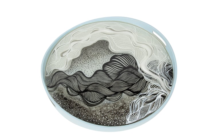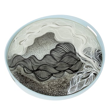 This multi layer resin art tray, meticulously crafted on MDF (Medium-Density Fiberboard), is a striking example of artistic functionality. Featuring an abstract, wave-inspired design, it flows with swirling lines and organic patterns that evoke the serene motion of water with a three-dimensional texture. Its color palette blends soft grays with contrasting black and white, creating visual depth and interest. The resin's glossy finish enhances the intricate details and ensures durability and ease of cleaning. This tray combines practicality with aesthetic appeal, making it an ideal choice for serving or as a decorative element in any modern home.